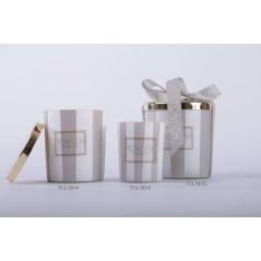 Candela profumata e dotata di vasetto in vetro. Senza coperchio.