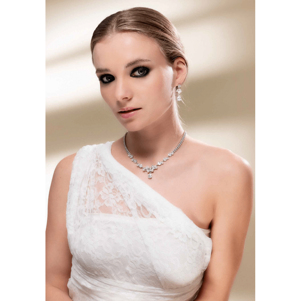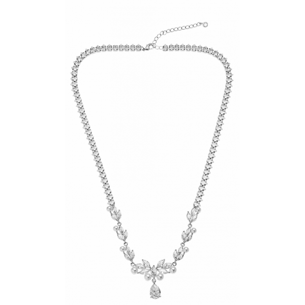Collana da donna della marca Ottaviani, il gioiello è realizzato in bronzo argentato ed è fatto in Italia, raffigura un girocollo modello Tennis semirigido con zirconi bianchi incastonati lungo il filo con perle d'acqua dolce ed uno zircone a goccia come ciondolo terminale.