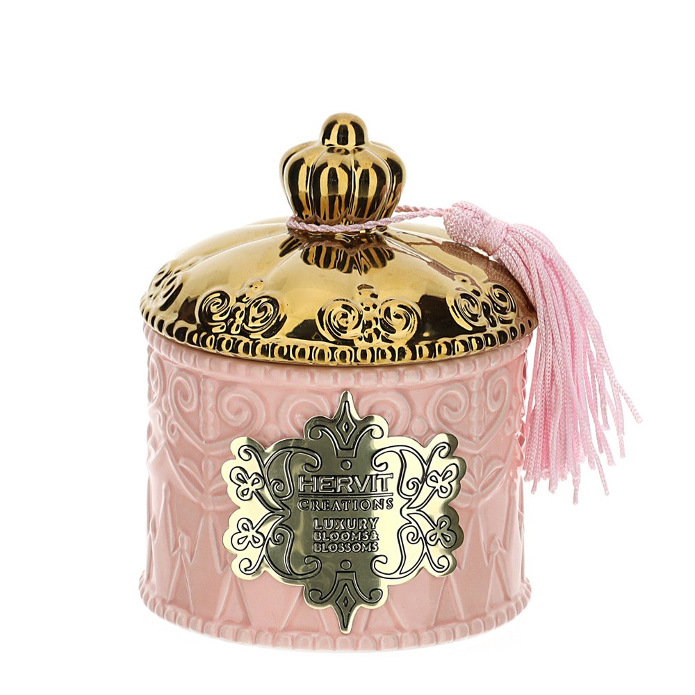 Contenitore in porcellana brunei rosa con coperchio oro e nappa rosa con scatola regalo.