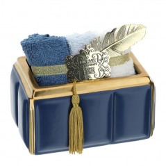 Contenitore rettangolare ceramica blu/oro con 3 lavette cotone blu/bianco con scatola regalo