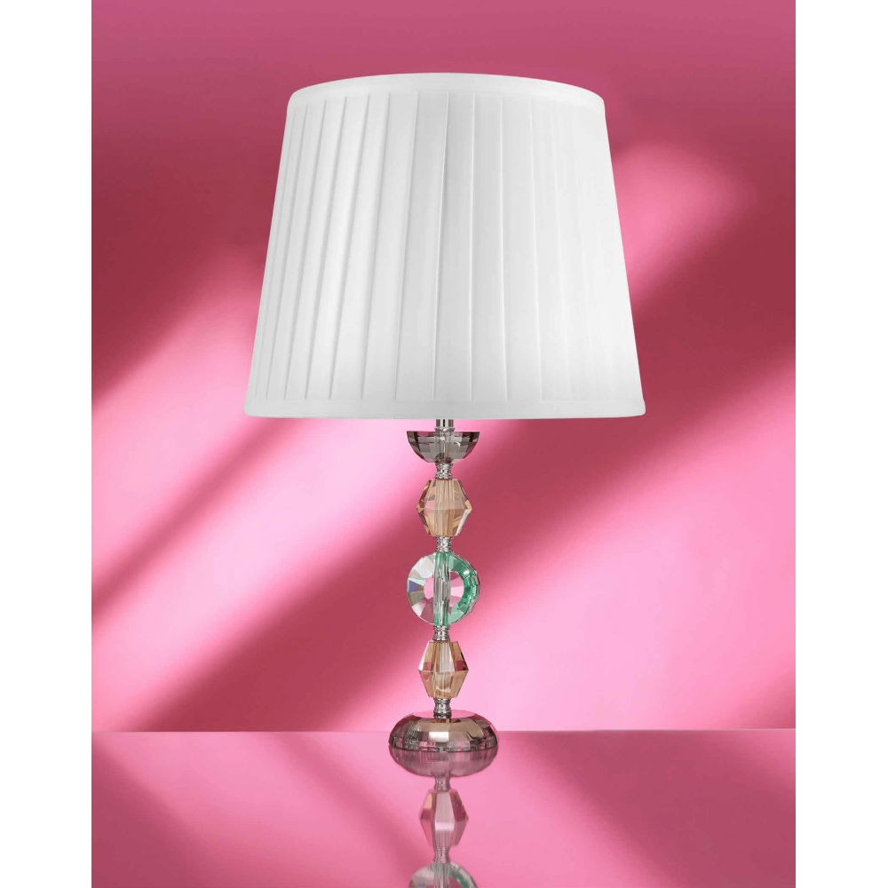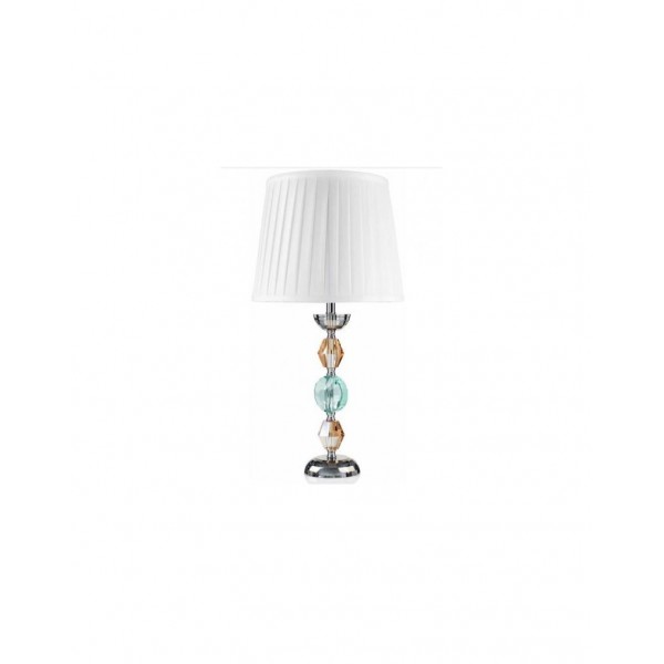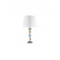 Lampada Cromia realizzata in cristallo di colore ambra e acquamarina con cappa in tessuto plissettato bianco-