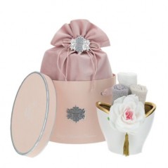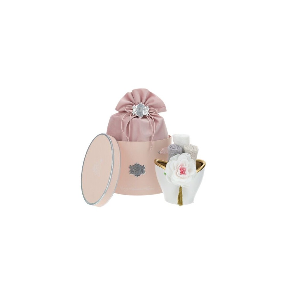 Vaso ovale in ceramica bianco/oro con 3 lavette sabbia più rosa sapone e cappelliera lux.