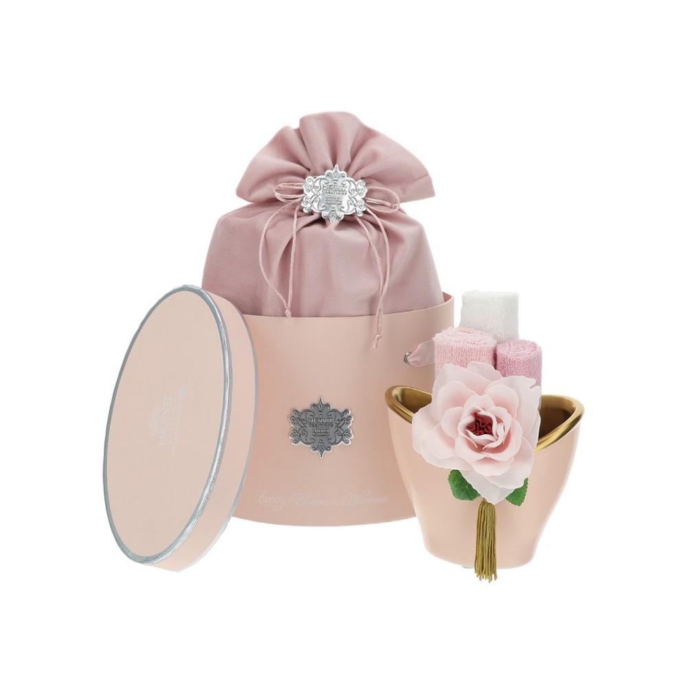 Vaso ovale in ceramica bianco/oro con 3 lavette rosa più rosa sapone e cappelliera lux.